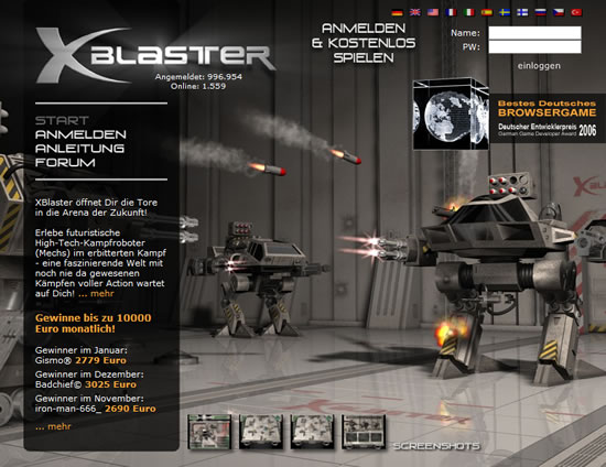 XBlaster ist ein kostenloses Action Online Spiel, das Science Fiction Fans überzeugen wird! Das Echtzeit Shooter Spiel XBlaster versetzt Dich in eine futuristische, verrohte Welt, in der zur Unterhaltung des Volkes Mechs, also Kampfroboter, in einer Arena gegeneinander antreten. Dir stehen zu Beginn drei Grundtypen von Mechs zur Auswahl, von dem Du einen wählen musst: der Hunter, der Ranger und der Defender. Jeder der Mechs hat spezielle Fähigkeiten und Spezialwaffen. Außerdem gibt es für alle Mechs Waffen und Schilde, die Du erforschen solltest. Dein Ziel ist es, der stärkste und beste Mech zu werden. Im Spielverlauf kannst du in Deinem Hangar Deinen Mech mit Kanonen, Schilden, Upgrades oder einer besseren Panzerung aufrüsten. Fühlst Du Dich bereit, dann stelle Dich packenden Duellen in der Arena und bezwinge Deine Feinde. Verschiedene Missionen, die Du lösen kannst, erhöhen Deine Skill-Punkte und Deinen Credit-Bestand. Du kannst Dir weitere Mechs kaufen und sie individuell aufbauen und ausstatten. Du hast auch die Möglichkeit Dir mit ein paar Euros Credits zu beschaffen. Im Hangar kannst Du Dich mit anderen Online Spielern per Chat austauschen und Du hast bei XBlaster in offenen Kämpfen sogar die Chance bis zu 10000 Euro zu gewinnen!